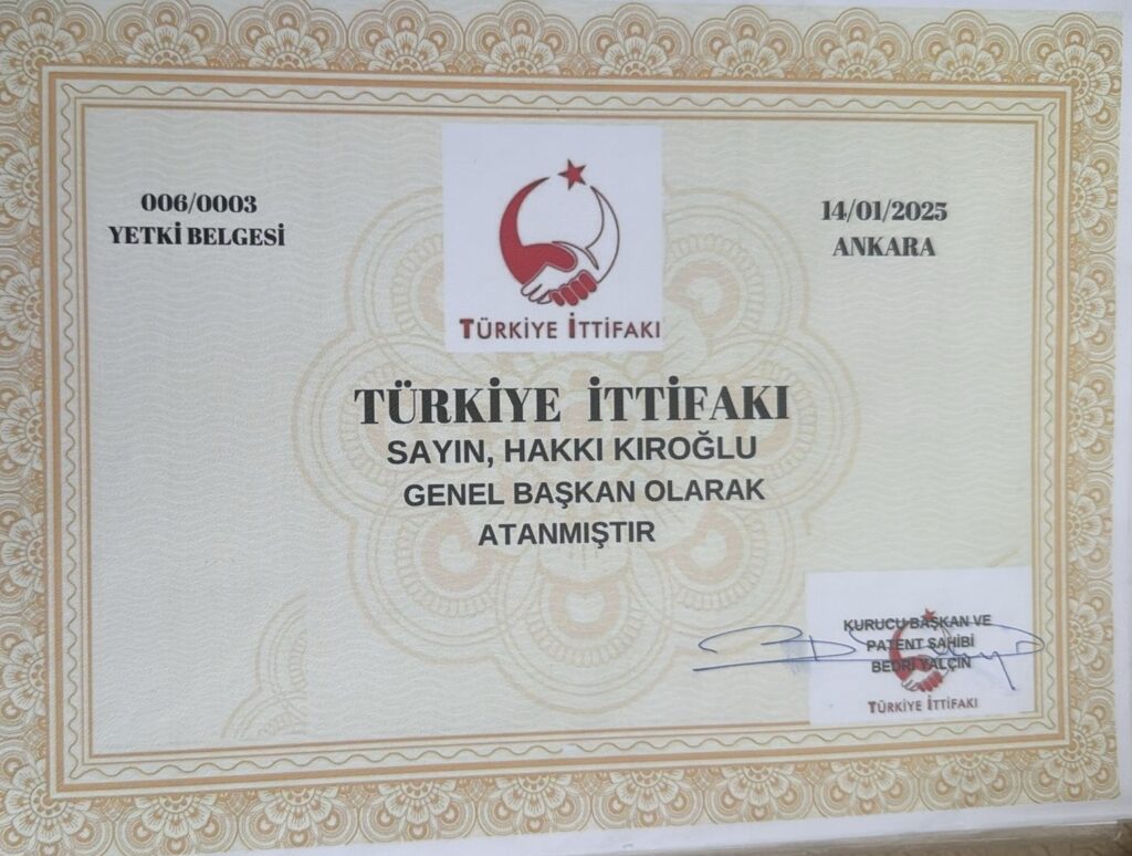 14/01/2025 Tarih ve 0009 Sayılı Kararı ile TÜRKİYE İTTİFAKI Genel Başkanı Patent Sahibi Sayın, Bedri Yalçın tarafından atanmıştır.